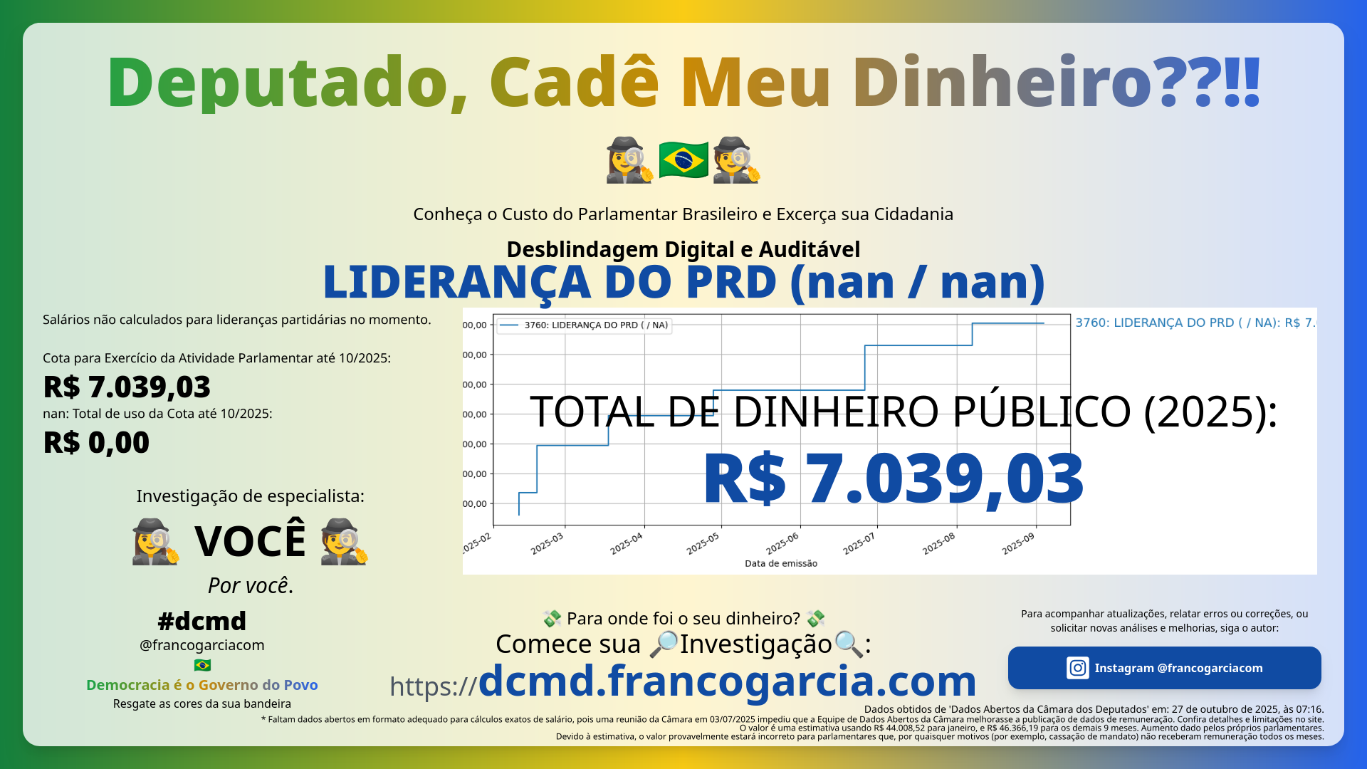 - Dentre 554 parlamentares e lideranças presentes nos dados de uso da cota, o gasto de R$ 7.039,03 de LIDERANÇA DO PRD (nan / nan) está na 👍🏆 548ª posição dos que mais gastaram com recursos da Cota para Exercício da Atividade Parlamentar;